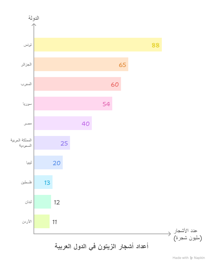 تُزرع أشجار الزيتون منذ آلاف السنين، وخاصة في منطقة البحر الأبيض المتوسط، حيث تعد جزءاً لا يتجزأ من الثقافة والاقتصاد والمطبخ العربي. ولا يعكس عدد أشجار الزيتون في أي بلد قدرته الإنتاجية فحسب، بل يعكس أيضاً التزامه التاريخي والزراعي بالشجرة المباركة. وفيما يلي نظرة عامة من خلال إحصائيات عام 2024 الصادرة عن المجلس الدولي للزيتون حول أعداد الأشجار بالدول العربية.