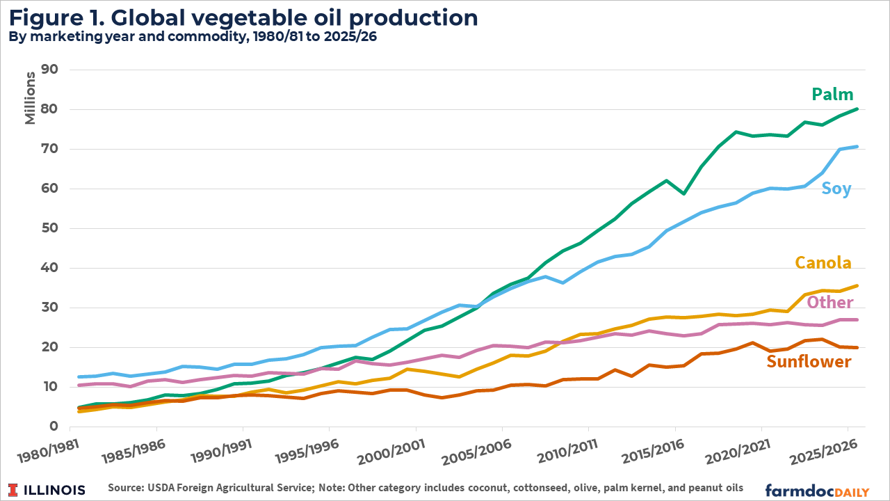 نظرة عامة على إنتاج الزيوت النباتية العالمي زيت فول الصويا وزيت النخيل هما الزيوت النباتية الرائدة في العالم، وهو مركز احتفظوا به منذ الثمانينيات عندما تجاوز زيت النخيل إنتاج زيوت الكانولا وعباد الشمس. يوضح الشكل 1 التغييرات في إنتاج الزيوت النباتية الرائدة بمرور الوقت. كان زيت فول الصويا لفترة طويلة أكبر زيت نباتي في العالم، لكن الإنتاج العالمي لزيت النخيل بدأ يتجاوز زيت فول الصويا بدءاً من السنة التسويقية 2004/2005. معاً، يمثلان أكثر من 60% من إمدادات زيت الطعام العالمية. تلعب الزيوت النباتية الأخرى مثل الكانولا وعباد الشمس وغيرها دوراً مهماً ولكن داعماً بشكل أساسي في تلبية الطلب العالمي.