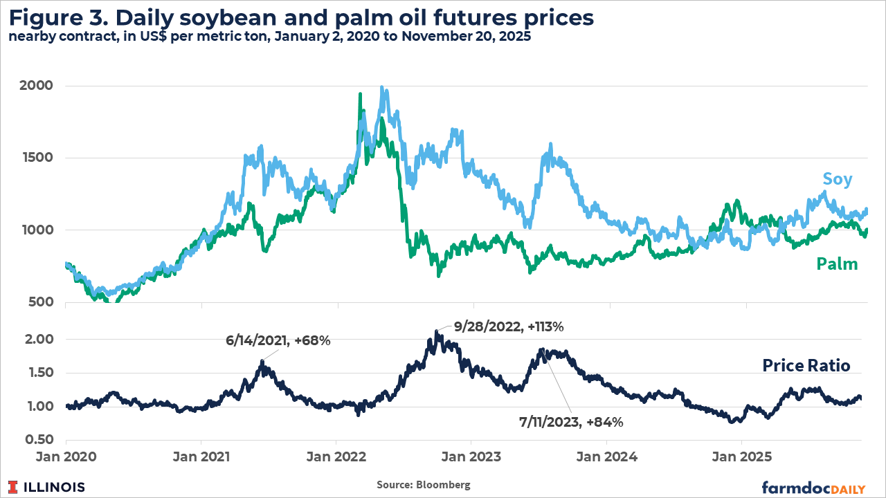 يوضح الشكل 3 أسعار العقود الآجلة لزيت فول الصويا وزيت النخيل اليومية القريبة من يناير 2020 إلى نوفمبر 2025، سواء من حيث المستويات أو من حيث نسبة السعر لزيت فول الصويا إلى زيت النخيل. تبدأ الأسعار في الاختلاف بدءاً من أوائل عام 2021. تعود نسبة السعر إلى التكافؤ تقريباً خلال ارتفاع أسعار السلع في أوائل عام 2022، ولكن هناك اختلاف حاد ثانٍ حيث انخفضت أسعار السلعتين عن ارتفاعات أوائل عام 2022. في منتصف عام 2023، تختلف الأسعار مرة أخرى مع ارتفاع أسعار زيت فول الصويا بشكل حاد. تصل نسبة السعر إلى التكافؤ في منتصف عام 2024، وبعد ذلك تتجاوز أسعار زيت النخيل أسعار زيت فول الصويا لفترة. كانت أسعار زيت فول الصويا أعلى قليلاً من أسعار زيت النخيل لجزء كبير من العام الماضي. بشكل عام، تتميز هذه الفترة بمزيد من التقلبات في نسبة السعر واختلافات أطول وأكثر حدة في السعر مما شوهد في الفترات الماضية.